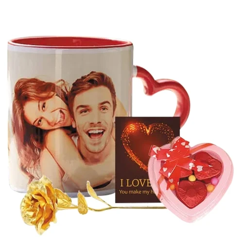 Let your loved ones cherish the moment with this gift of Alluring Personalized Photo Mug with Heart Chocolate N Rose created with the essence of your love for them. This combo gift contains a Personalized Photo Heart Handle Coffee Mug with 3 pc Heart Shape Chocolate, Golden Rose and I love You Card.