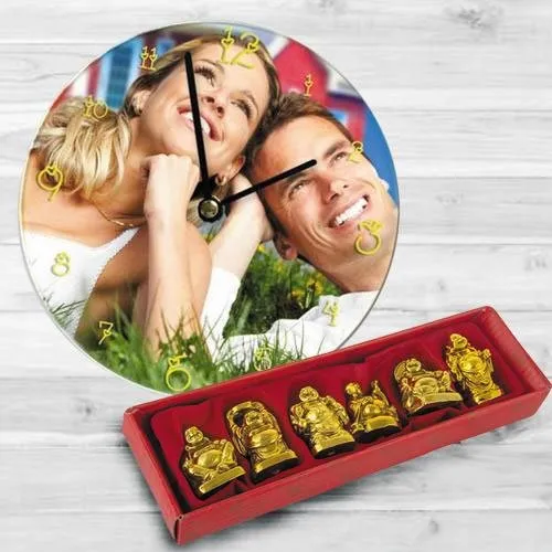 Pamper your mother with this gift of Charming Personalized Photo Wall Clock with Laughing Buddha on this Mothers Day and make her feel special in the best possible way. This combo features a Personalized Photo Glass Round Wall Clock with 6 pc Laughing Buddha Set.