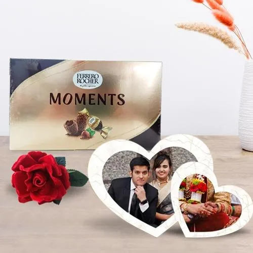 Make your Valentines Day more memorable with this lovely gift of Delectable 16 pcs Ferrero Rocher Moment Chocolates N Twin Heart Personalized Photo Frame with Red Velvet Rose Gift Combo and curve your name on the hearts of your loving Hubby.