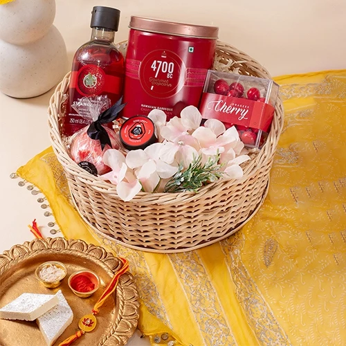 Delight your loved ones with this thoughtfully curated gift hamper that brings together indulgence and elegance in a perfect blend. It features the savory crunch of 4700BC Hawaiian BBQ Cheese Popcorn (50gm), paired with the sweet richness of Cherry Dragees (70gm), offering a treat for the senses. Pamper them with a luxurious bath experience using The Body Shop Strawberry Shower Gel (350ml) and the nourishing Strawberry Lip Balm (10ml), complemented by a soothing bath bomb for the ultimate relaxation. The vibrant flower arrangement adds a touch of freshness and charm, beautifully presented in a reusable round basket. To complete the festive spirit, a traditional Meenakari Rakhi adds cultural warmth, making it a perfect gift of love, care, and celebration.