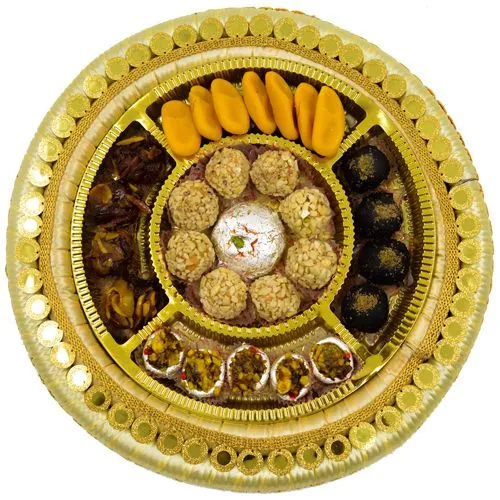 This platter is a well-rounded assortment of sweet indulgences starting with 4 pieces of Kaju Butter Scotch Balls that bring a creamy, crunchy fusion to the table. It also features 4 Kaju Choco Balls for those who enjoy the combination of cocoa and cashew. 4 pieces of Kaju Katori offer a crisp shell filled with a nutty medley, while 4 Khajur Dry Fruit Laddoos add wholesome sweetness. A single Sattoo Ladoo adds a hearty texture and flavour, rounding out the profile with a touch of tradition. Finally, the 6 pieces of Kesaria Peda add a smooth and saffron-rich finish.
