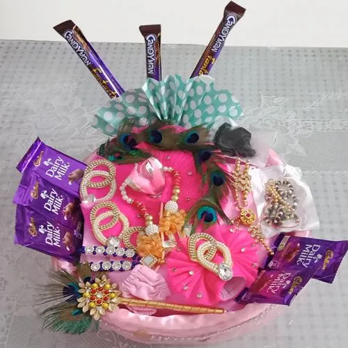 Order for delivery of this elegant gift basket to your special one. This is a truly splendid gift having a Ladoo Gopal Dress Set with Jewellery for the lord and Cadbury chocolates.