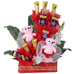 Merge your love with this Blissful Array of 2 Cute Pink Teddies with Delicious Small Cadbury Dairy Milk N Five Star Chocolates arranged in a Basket and send it to your dearest ones.