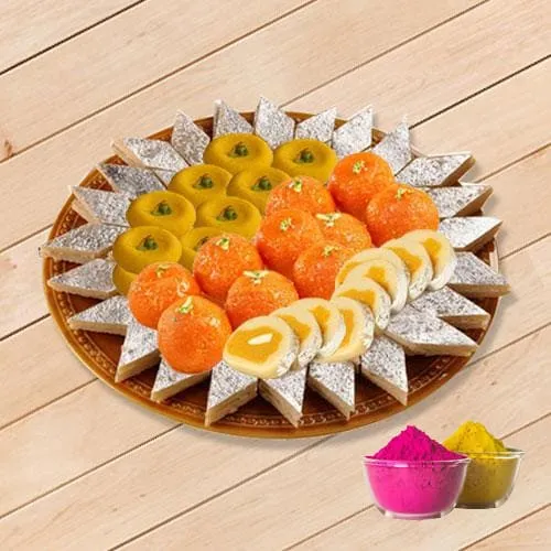 Tether your loved ones to your heart by sending this Enticing Assorted Sweets from Bhikaram and surprise them with your special gesture. This hamper includes Kaju Barfi, Kesar Peda, Desi Ghee Laddoo n Mawa Gilori (1 kg: Gross Weight) and Free Organic / Herbal Gulal (2 pkts)