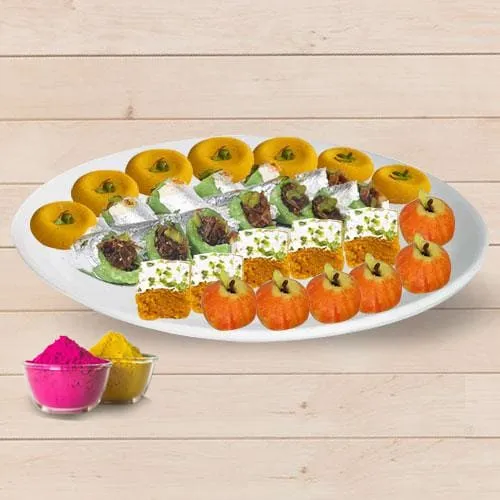 Sweeten your relationships by sending this Exclusive Mixed Sweets from Bhikaram for Holi to your close ones who deserve your love. This item includes Kaju Paan, Kesar Peda, Mawa Apple, Dilkhushal (1 kg: gross weight) with Free Herbal Gulal.