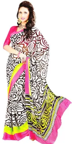 This is a gorgeous black and white printed georgette satin saree. The design and border decked with the shades of pink and yellow are the center of attraction of this saree. It also comes with matching blouse piece.