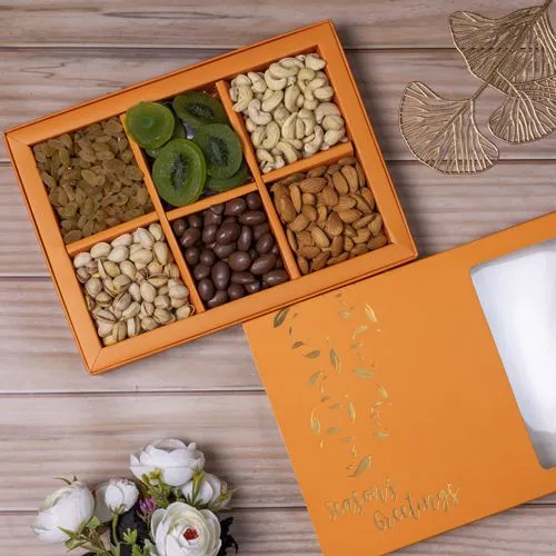 This luxurious hamper brings together the finest selection of premium dried fruits and nuts, including 125 grams each of raisins, pistachios, dried kiwi, chocolate-coated almonds, cashews, and almonds. Perfect for indulgent snacking or sharing, this gift set is packaged in a reusable gift box, making it a versatile and thoughtful present for any occasion. With its balance of health and indulgence, this hamper is sure to delight anyone who receives it.
