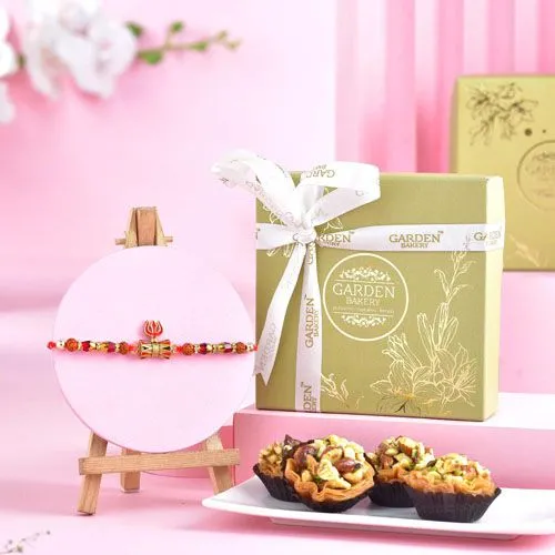 Celebrate the bond of love with the Rakhi Delight Gift Set. This thoughtfully curated hamper includes a delicious Mini Baklawa Box with 4 pieces, each bite offering a burst of flavors with its flaky layers and rich fillings. Complementing this sweet treat is a Premium Single Rakhi, meticulously designed to adorn your brother�s wrist with love and blessings. To complete the traditional touch, we include a Roli Chawal Card, making this gift perfect for the auspicious occasion. Surprise your sibling with this perfect blend of sweets and tradition that epitomizes your heartfelt affection.