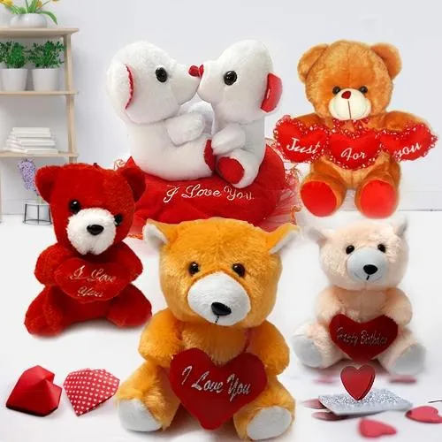 Mould your relationships into more special ones by sending this Soft N Cute Teddies for Valentines Day to the people you adore. Make your loved one happy with this 5 set of Teddies added with I L U Singing Teddy, 8in Red Teddy, 12in Cute Teddy, Teddy with 3 hearts N Kissing Teddy in a Heart.