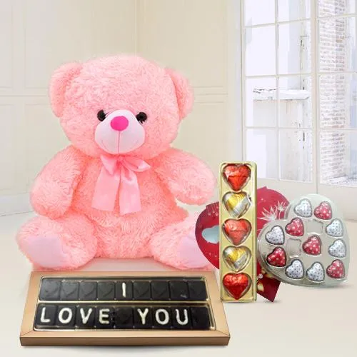 Gift this amazing I Love You Chocolates Hamper to the one who deserves it the most from you. It consists of, 1) 8 inch Teddy 2) 18 Pcs I Love You Homemade Chocolates 3) 5 Pcs Golden Heart Chocolate, 4) 11 Pcs Red Heart Homemade Chocolates 5) A Heart Shaped Key Ring.