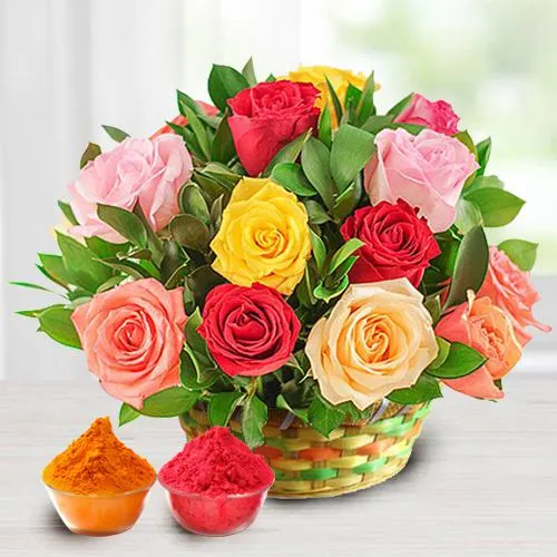 18 Pink and Red Roses Arrangement with greens and fillers to show your love and affection with free Gulal/Abir Pouch.