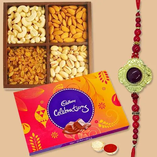 Send a designer Rakhi for brother with a Cadburys Celebration Chocolate Bar n 250 gm Assorted Dry Fruits on Rakshabandhan. Free Roli Tika Chawal included