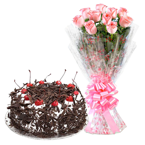 Delivery this Combo of 1/2 kg Black Forest Cake with 10 Pink Roses Bouquet for Mothers Day celebrations & delight her on this eventful day.