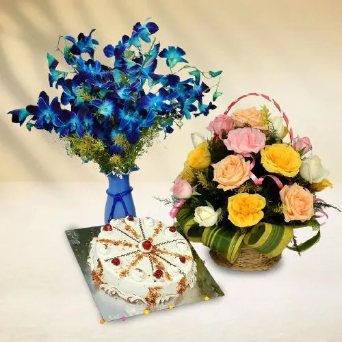 Order online these Elegant Blue Orchids in Vase with Roses Basket N Butter Scotch Cake. This flowers gift combo include: