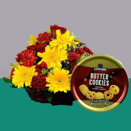 Gift online this Exclusive Mixed Flowers Basket with Sapphire Butter Cookies and surprise your relatives and friends.