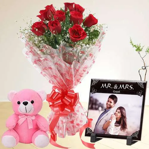 This gift combo includes a 10 Red Roses Bouquet, Personalized Photo Tile n a Cute Teddy (6 inch). Photo Tile dimension is 4x4 inch and includes a digital photo.