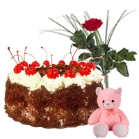 Cheer up your special ones by sending this exclusive gift combination of Delectable Fresh Soft Black Forest Cake with a Cute Teddy Bear and One Single Red Rose. This 1/2 Kg. Black Forest Cake is hand delivered to ensure freshness.