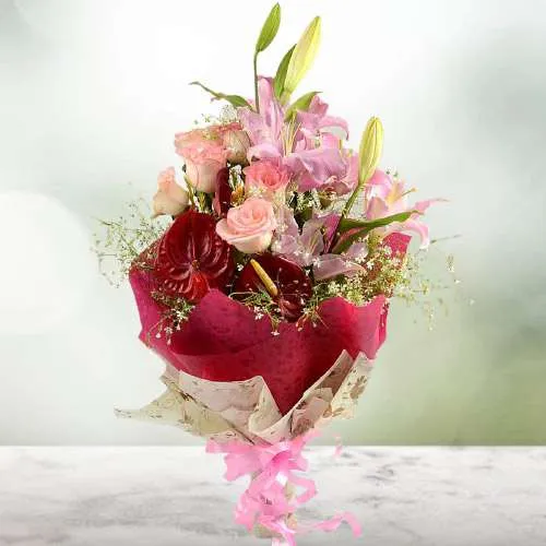Treat your near and dear ones in an exclusive way with this Oriental Love Arrangement of Roses, Lily n Anthuriums, and make them feel very special.