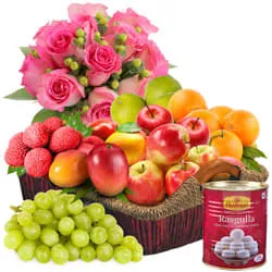 Spread smiles all over the lives of the people you love by sending them this Impressive Bouquet of 10 Pink Roses with 1 Kg Haldirams Rasgulla N 2 Kg Fruits Basket that showers its beauty upon those people to make them happy. This Fresh Fruits Basket comes packed with Apple and Seasonal Fruits. (Note Image is indicative, Delivery of Seasonal Fruit will be based on availability).