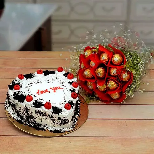 Engage in the true spirit of celebration by sending online this Remarkable combo of 16pc Ferrero Rocher Chocolate Bouquet with Heart Shape Black Forest Cake (1kg) that instantly uplifts the mood.