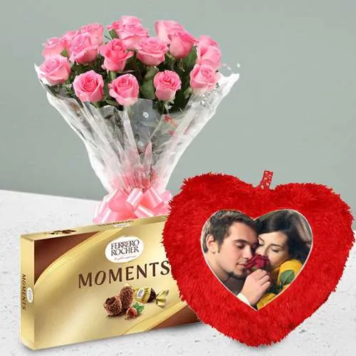 Create magical moments by ordering online this Soothing Gift of 15 Pink Roses Bouquet with Personalized Photo Cushion n 16pc Ferrero Rocher Moments Chocolate Box for your loved ones and spread your warm feelings into their hearts.