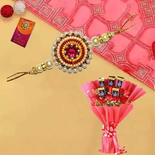 Delight your brother this Raksha Bandhan with a gift that speaks volumes�6 stunning red roses that convey deep love, alongside 6 individually wrapped Cadbury Dairy Milk chocolates (13gm each) elegantly presented with fillers and tied with a ribbon for a refined look. Complementing this is a classic Rakhi, symbolizing protection and affection, completing a thoughtful gift that balances freshness, sweetness, and tradition. This set is ideal for making your sibling feel truly special and appreciated on this meaningful occasion.